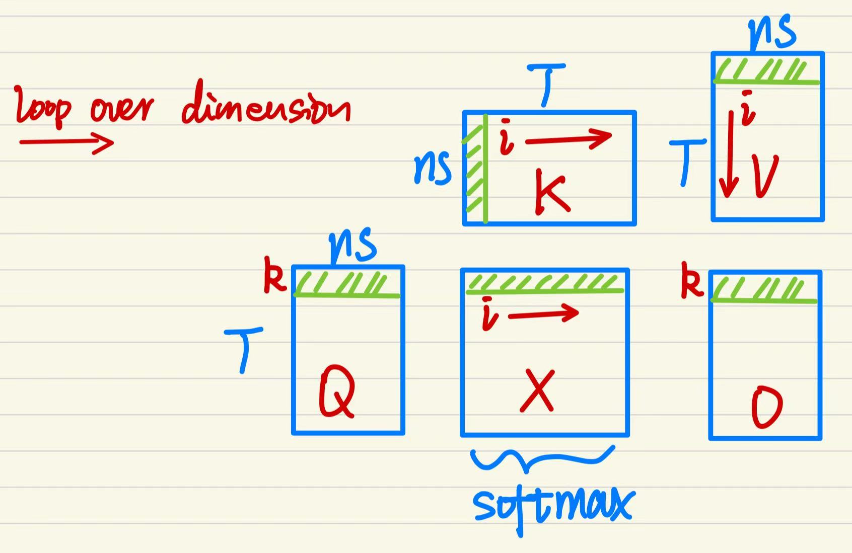 We start with the definition where inputs \(Q, K, V\) typically have shapes \((B, \text{nhead}, T, ns)\). Since batch and head dimensions are independent from attention weights computation, we focus on the sequence length \(T\) and the embedding dimension \(ns\). The illustration below breaks the computation of a single head of self-attention into matrice multiplications. The attention formular is \(\begin{equation} O=\text{Attn}(Q, K, V) = \text{softmax}\left(\frac{QK^T}{\sqrt{d_k}}\right)V~. \end{equation}\) The k-th row of the output matrix is \(\begin{equation} O[k, :]=\sum_{i=1}^T X_s[k, i]\cdot V[i, :]~, \end{equation}\) where \(\begin{align} X_s[k, i]&=\text{softmax}\{i=1:T\vert x_i=X[k,i]=\frac{Q[k, :]K[i, :]^T}{\sqrt{d_k}}\}\\ &=\{i=1:T|\frac{e^{x_i}}{\sum_{j=1}^T e^{x_j}}\}~. \end{align}\)
